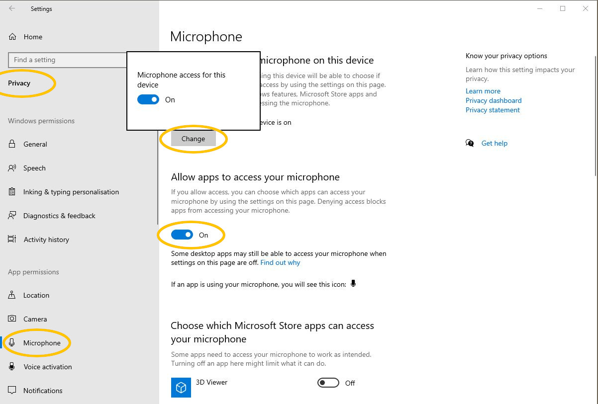 There are three settings that must be ‘On’ (see screenshots): General Microphone access (use the ‘Change’ button), apps access, and desktop apps access.
