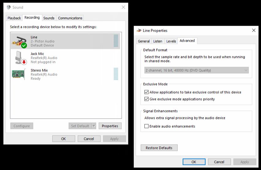 – Check in the Windows Sound settings if the correct input device is selected (Pictor Audio) and that its volume is set to 100 (this can be adjusted in the device properties). If you get an empty sound file when recording, and can’t hear sound playback, this is likely to be the issue.